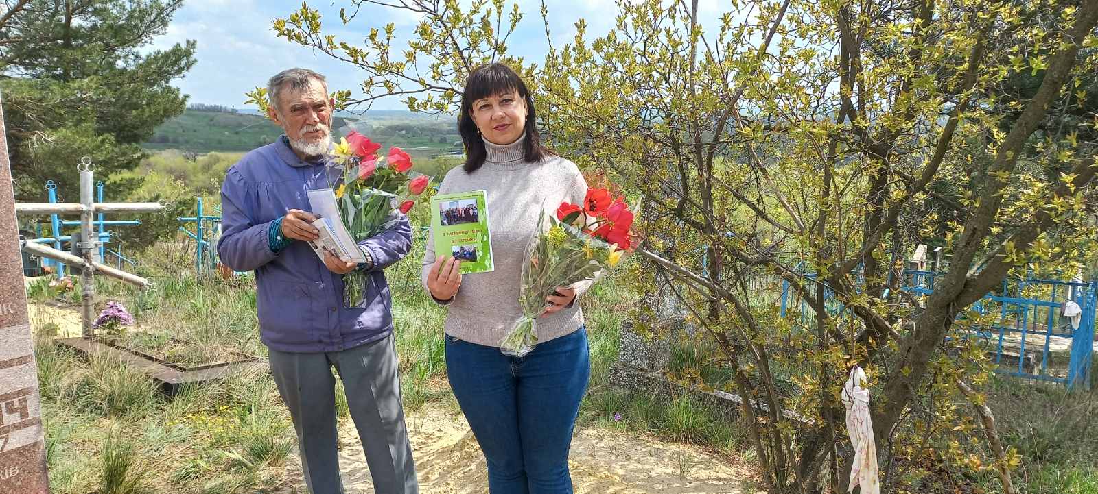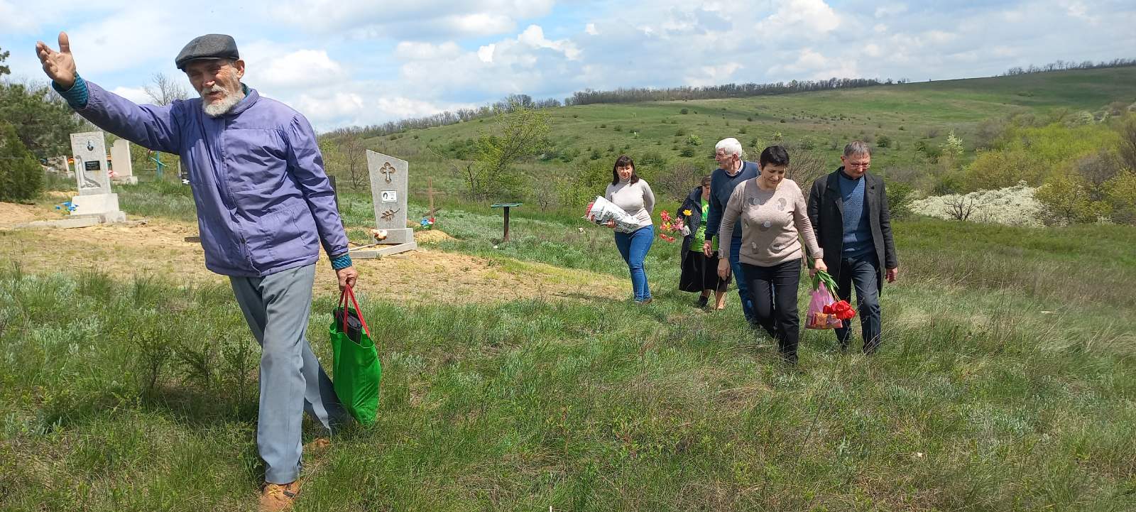 Звичайно, мова зайшла за рідних і близьких, що перебувають нафронті, кують перемогу над рашистською сатаною (під Гуляй Полем, Бахмутом і Великоновоселівкою). Далі, як домовились, ескорт із квітами і поминальними гостинцями рушив у знамениту Крутоярівку. Згодом до нас приєдналася група слов’ян на чолі з головою селищної громади Г.І. Смольською.