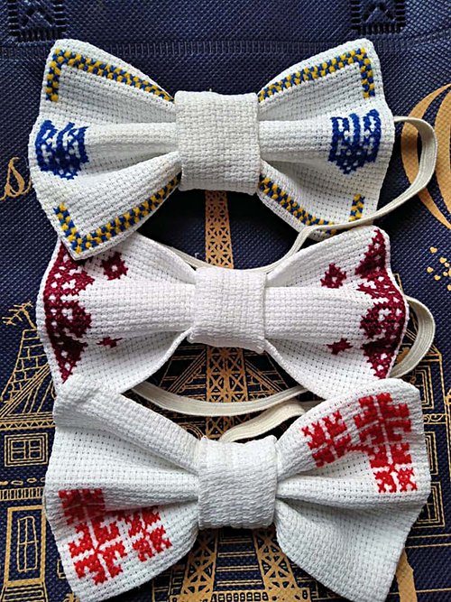 “Краватка-метелик для юного патріота, справжнього українця! Вишитий умілими руками нашої майстрині з Дніпропетровської області Юлії Чубченко. Вона люб’язно переслала свої вироби нам на ярмарок. Ціна 80 грн за один. Кошти на ЗСУ”.