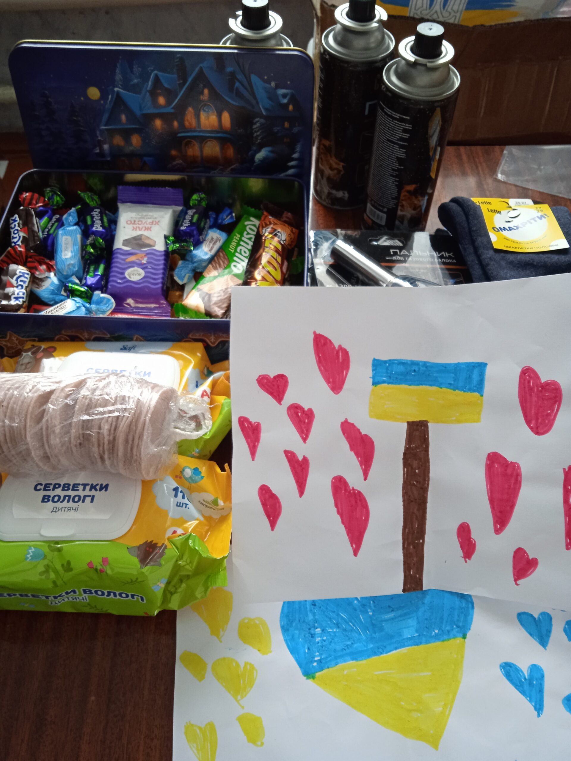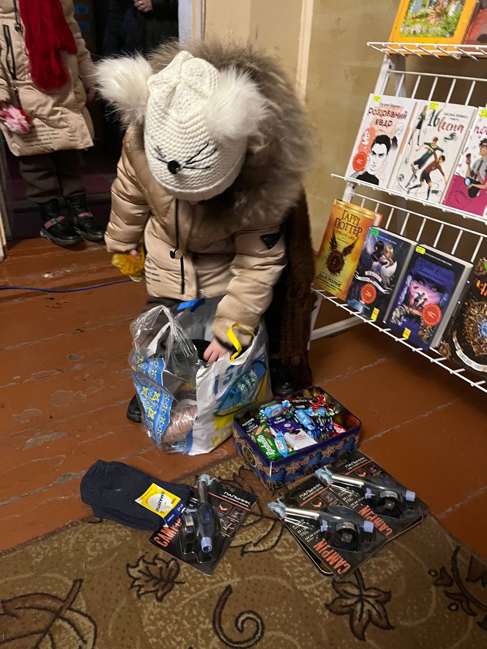 У пакеті виявились дуже корисні речі: шкарпетки, газові горілки, парафінові розпалювачі, цукерки – усе те, що наразі люди приносять до бібліотеки аби потім воно потрапило до захисників. І коли малечу запитали, для кого ж усе це добро, відповідь була очікувана – для солдатів.