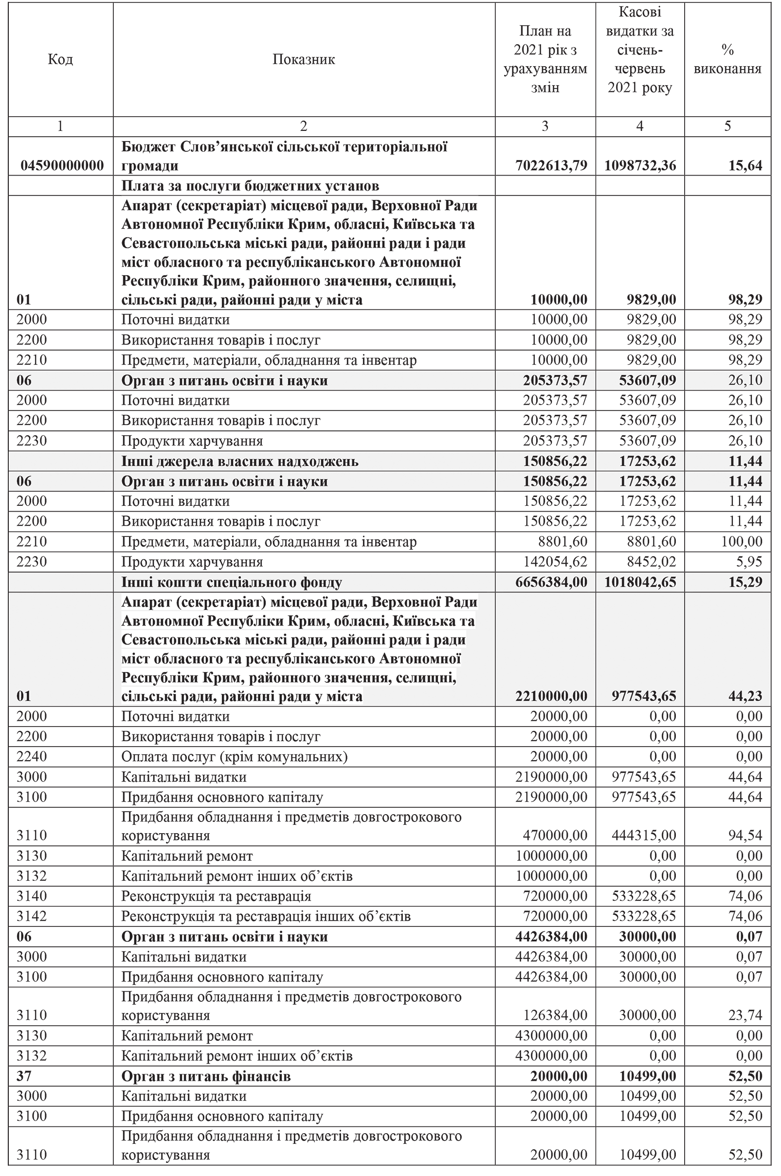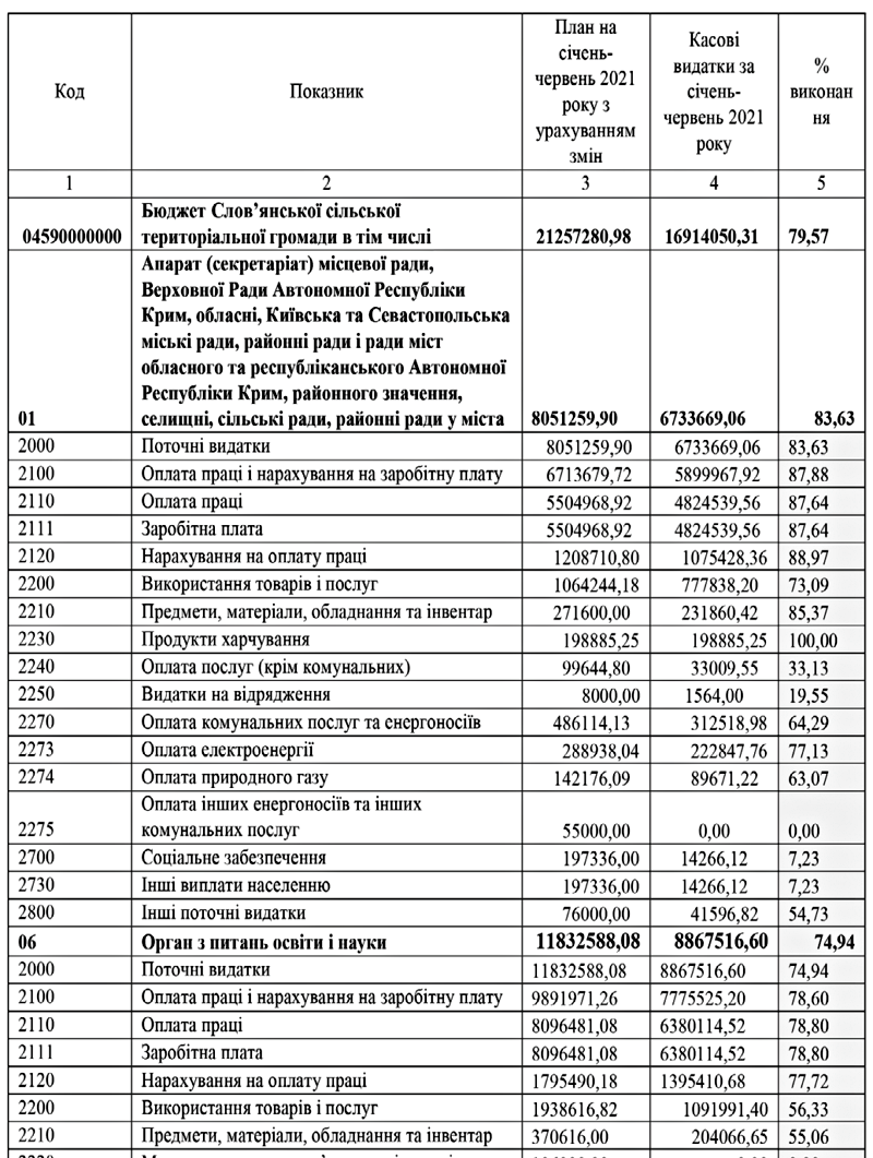 Звіт про виконання доходної та видаткової частини бюджету Слов’янської сільської територіальної громади за 1 півріччя 2021 року