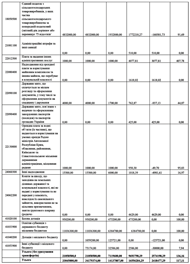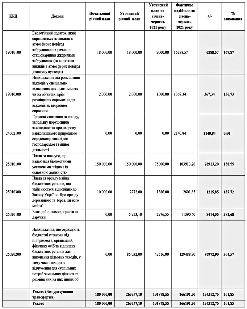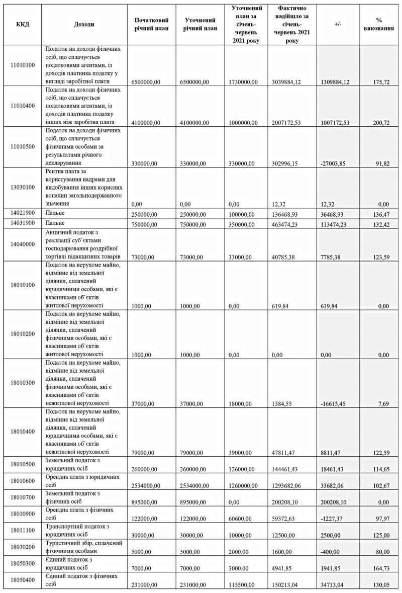 807,00 гривень, фактично надійшло за І півріччя 2021 року 16 556 284,29 гривень, що на 2 418 477,29 гривень більше від запланованого. Відсоток виконання – 117,11%.