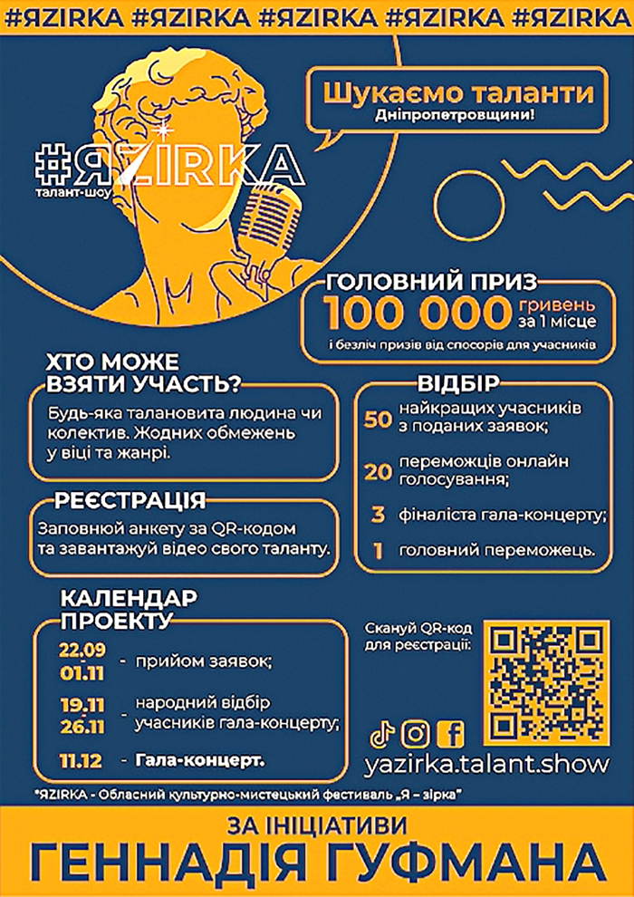 – Два попередні відбіркові тури і фінал. Подача заявок та онлайн-відбір першого туру триватимуть до 1 листопада. Заявку на участь може подати будь-який мешканець Дніпропетровщини. Потрібно лише записати відео та опублікувати його в TikTok з хештегом #ЯZIRKA або відправити на пошту оргкомітету. Таким чином ми визначимо 50 учасників, що пройдуть до другого туру.