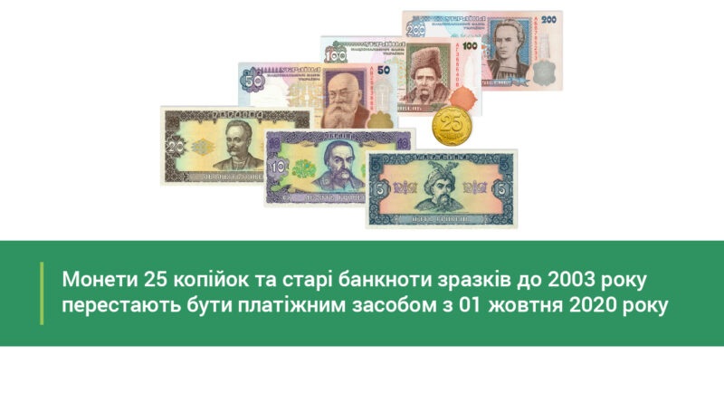 З 1 жовтня 2020 року монети номіналом 25 копійок та банкноти гривні старих зразків до 2003 року перестають бути засобом платежу.