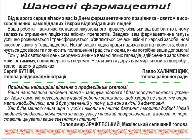 Офіційно Привітання з Днем фармацевтичного працівника від керівництва району і ОТГ 19 Вересня, 2020 Redactor Переглядів: 1 278