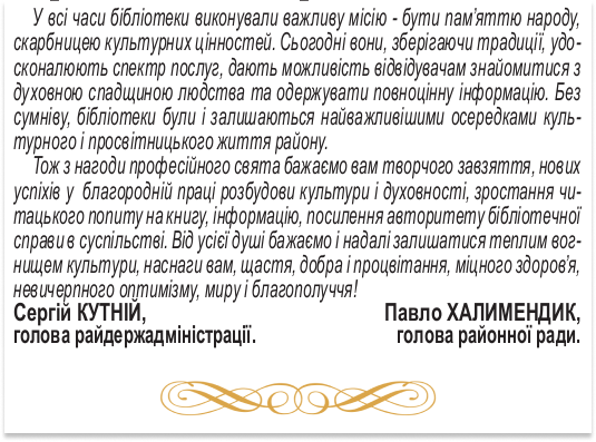 Офіційно Привітання з нагоди Всеукраїнського дня бібліотек від керівництва району і громади 28 Вересня, 2020 Redactor Шановні бібліотекарі! Прийміть найщиріші вітання з нагоди Всеукраїнського дня бібліотек. Переглядів: 949