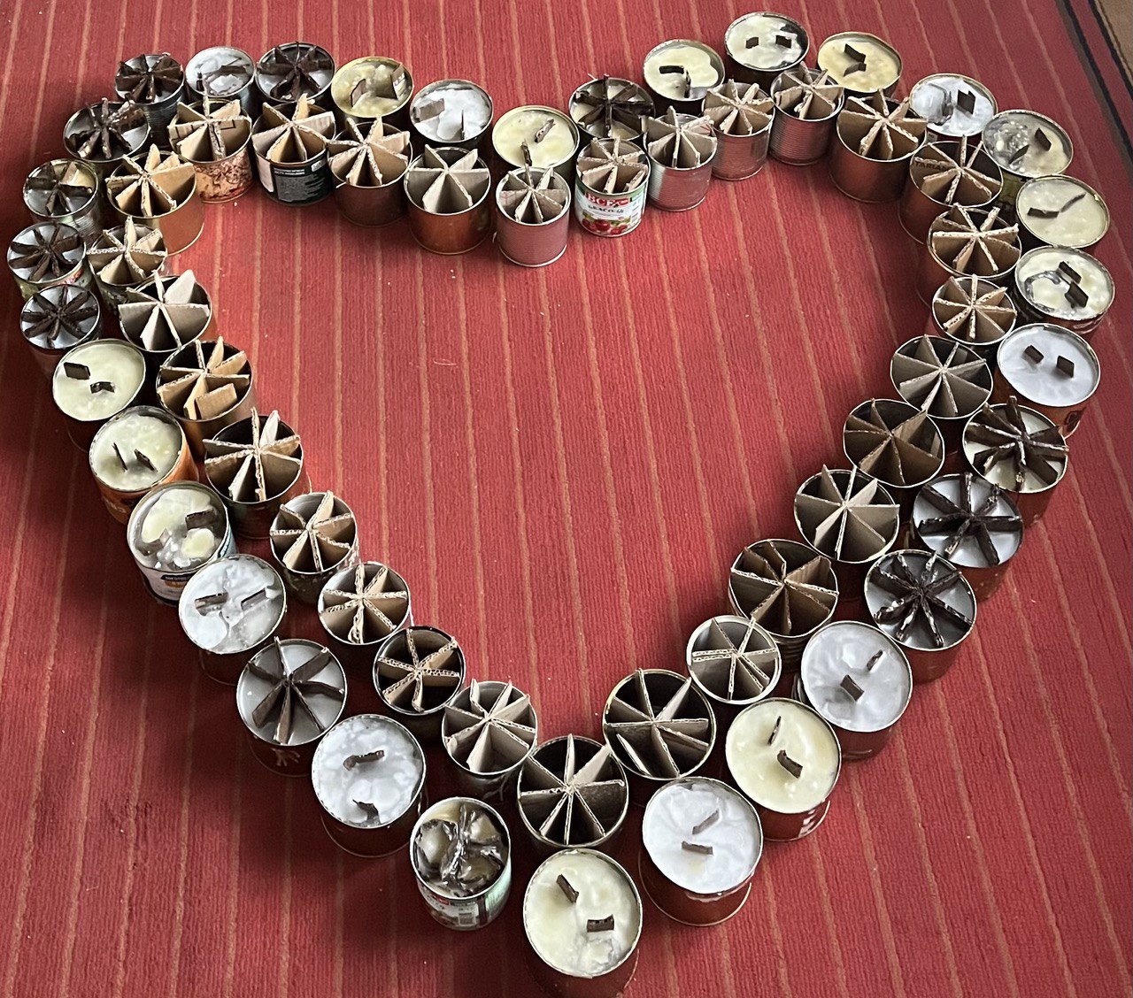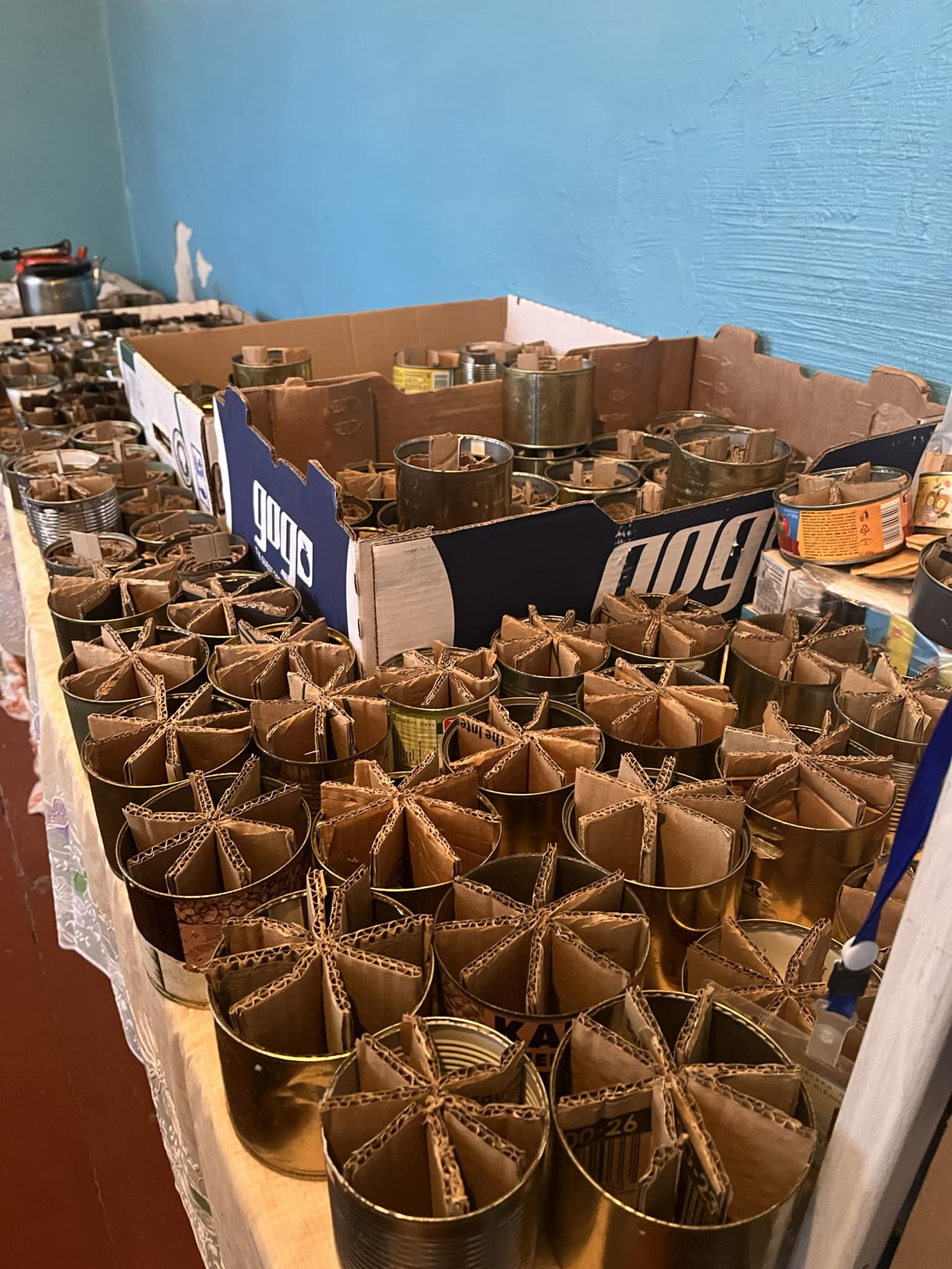 У «дорослій» бібліотеці ми нарізаємо картон на смужки необхідної ширини – для банок різного розміру (тушонка, горошок, кілька, гурмешки – так ми їх звемо для зручності). Картон збираємо у магазинах, також наші користувачі приносять разом із недопаленими свічками, воском. Несемо підготовлені смужки в дитячий відділ, і там дівчата роблять заготовки. Якщо є трохи часу, йдемо до них, робимо свічки-«зірочки».