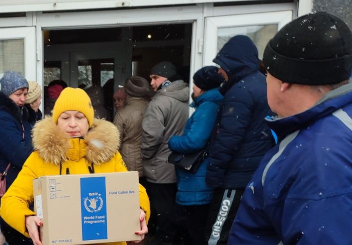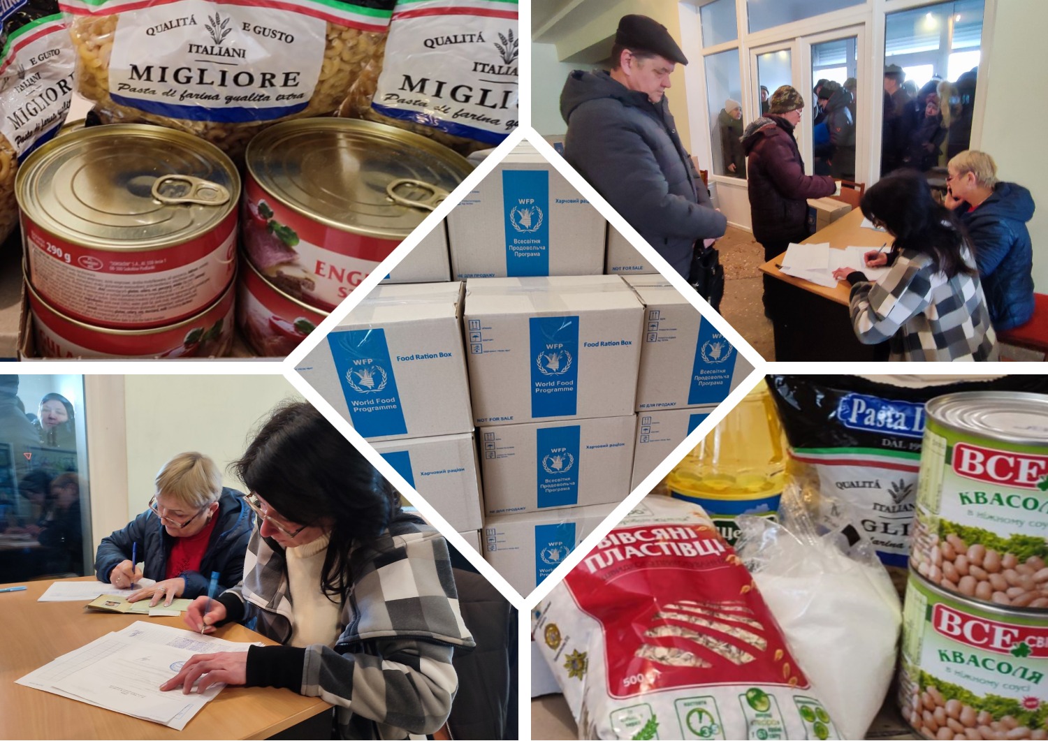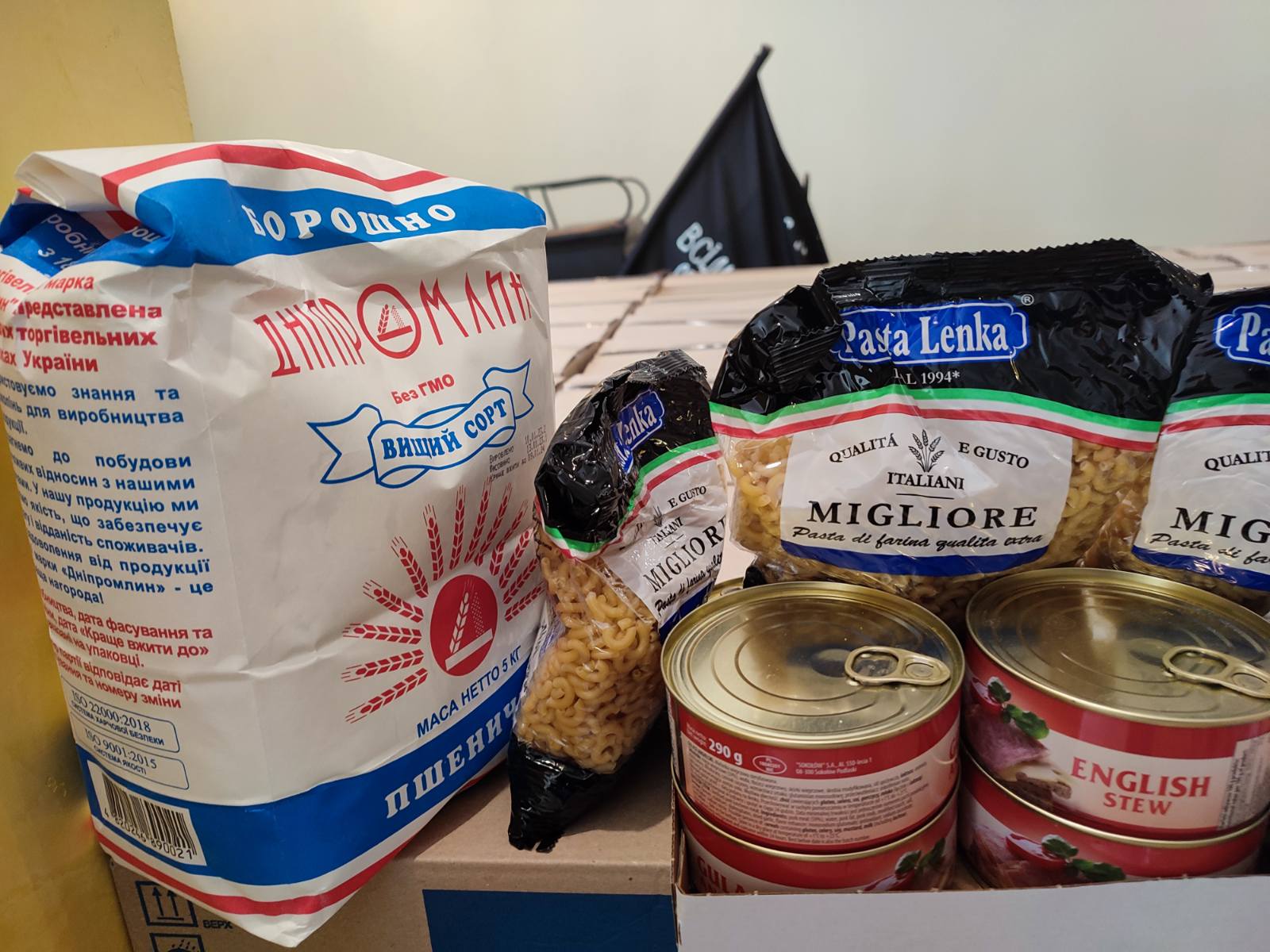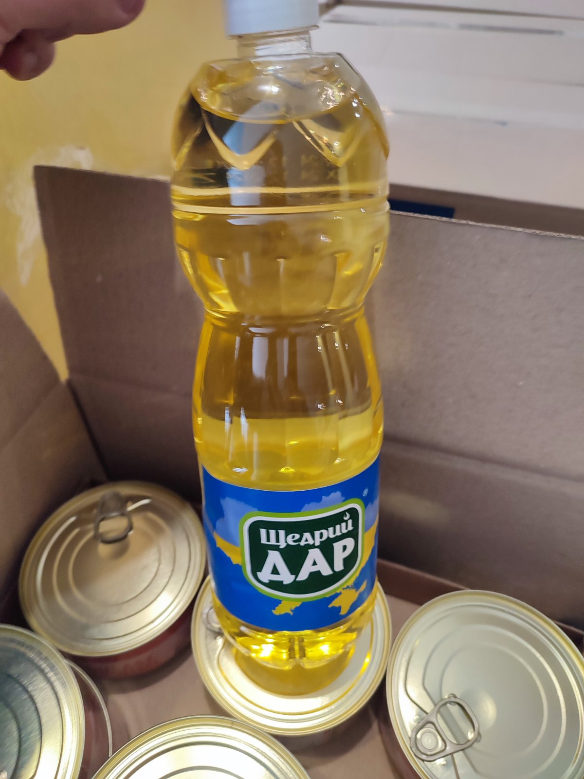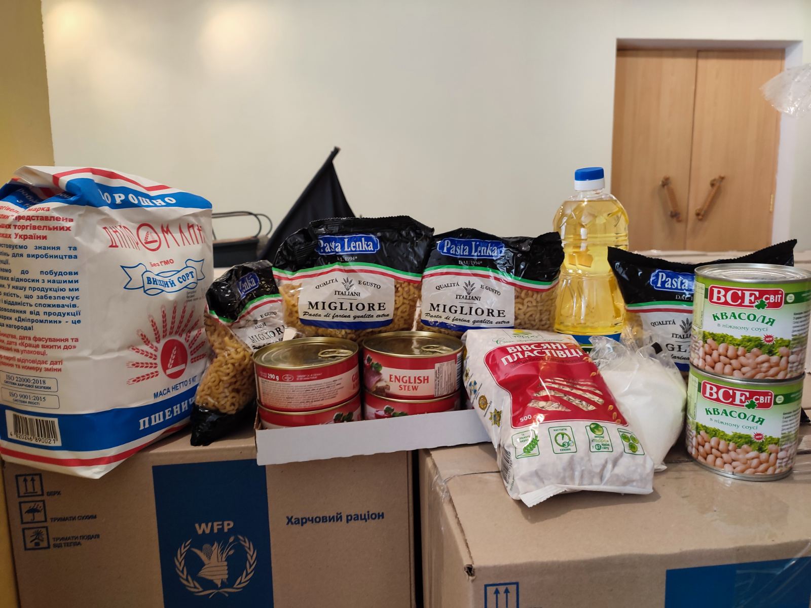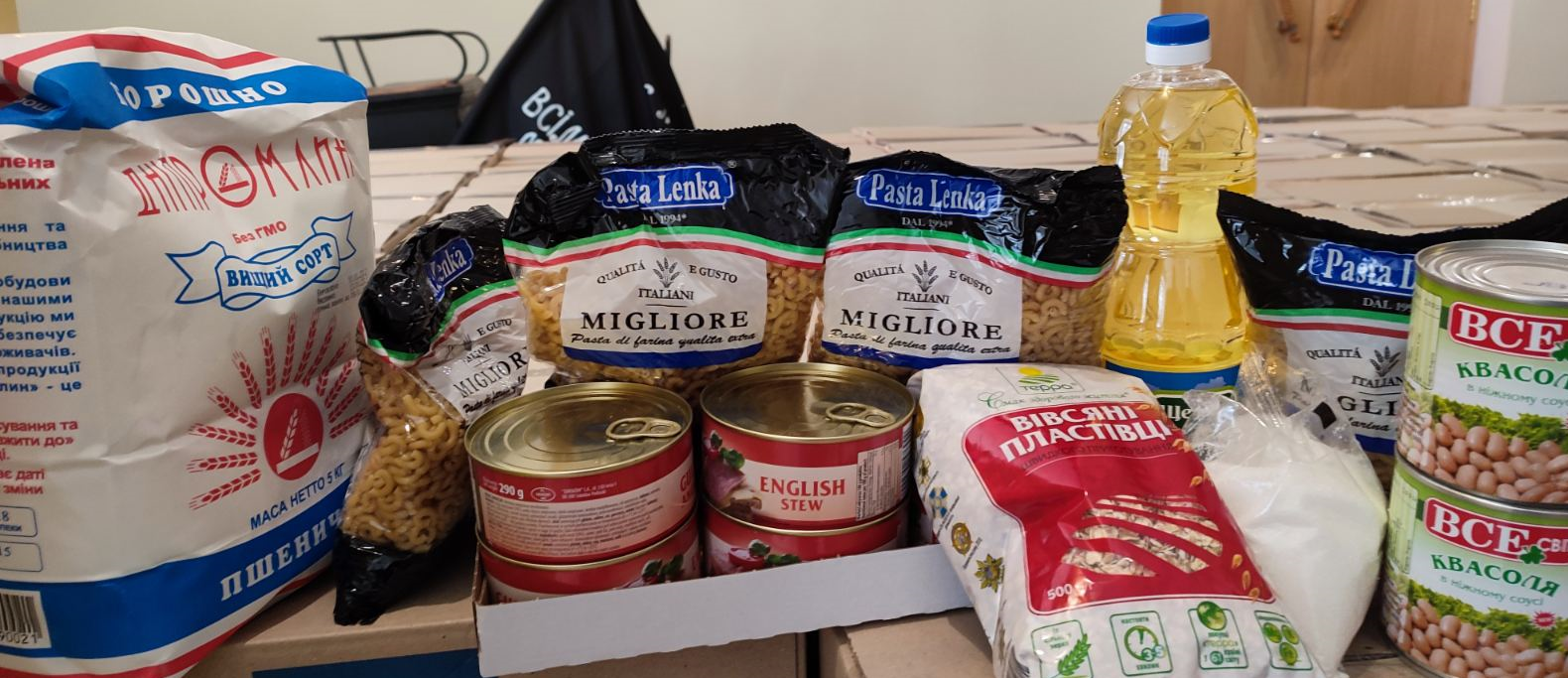 До продуктових наборів входять: борошно, м’ясні консерви та консервована квасоля, соняшникова олія, цукор, вівсяні пластівці.