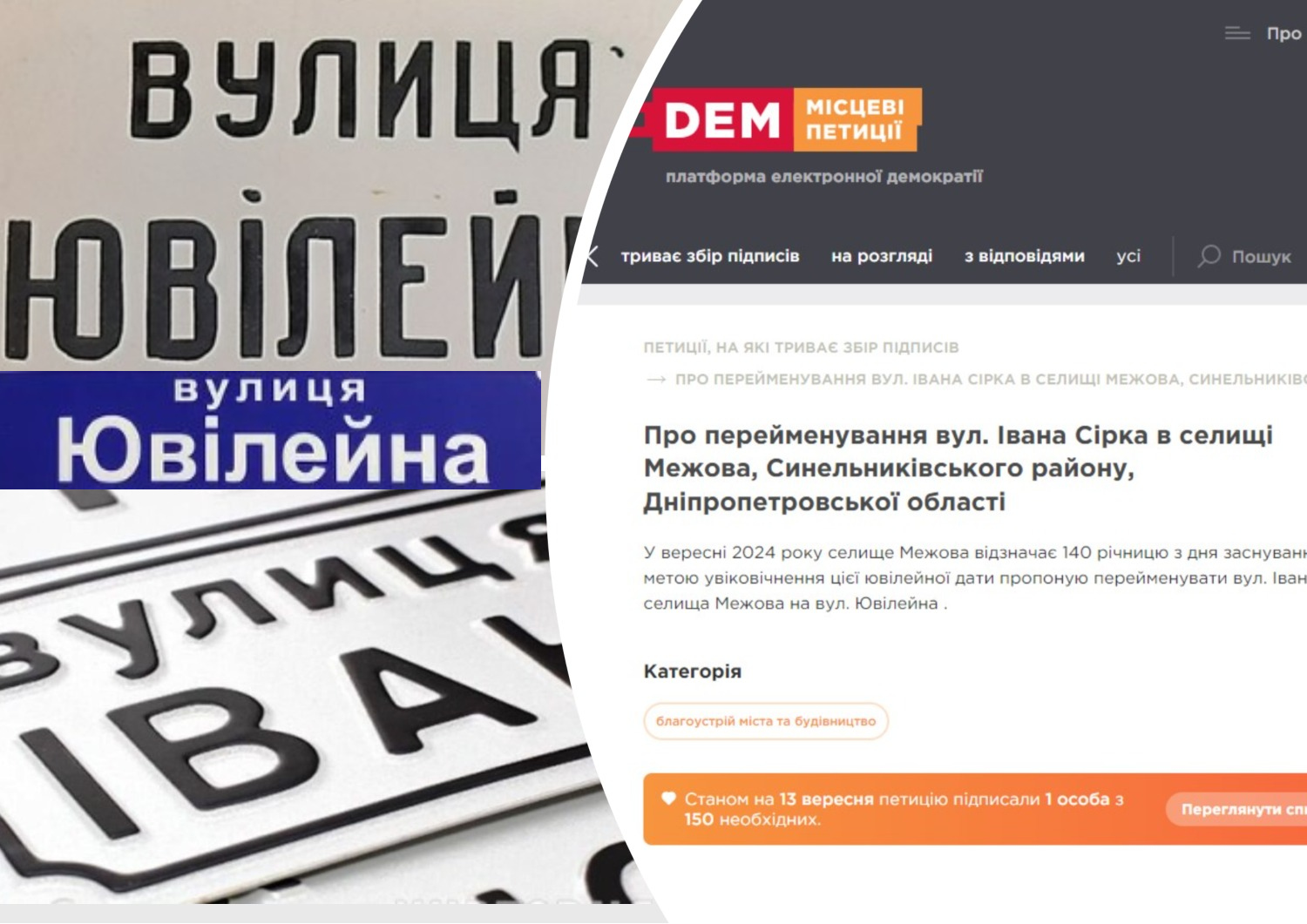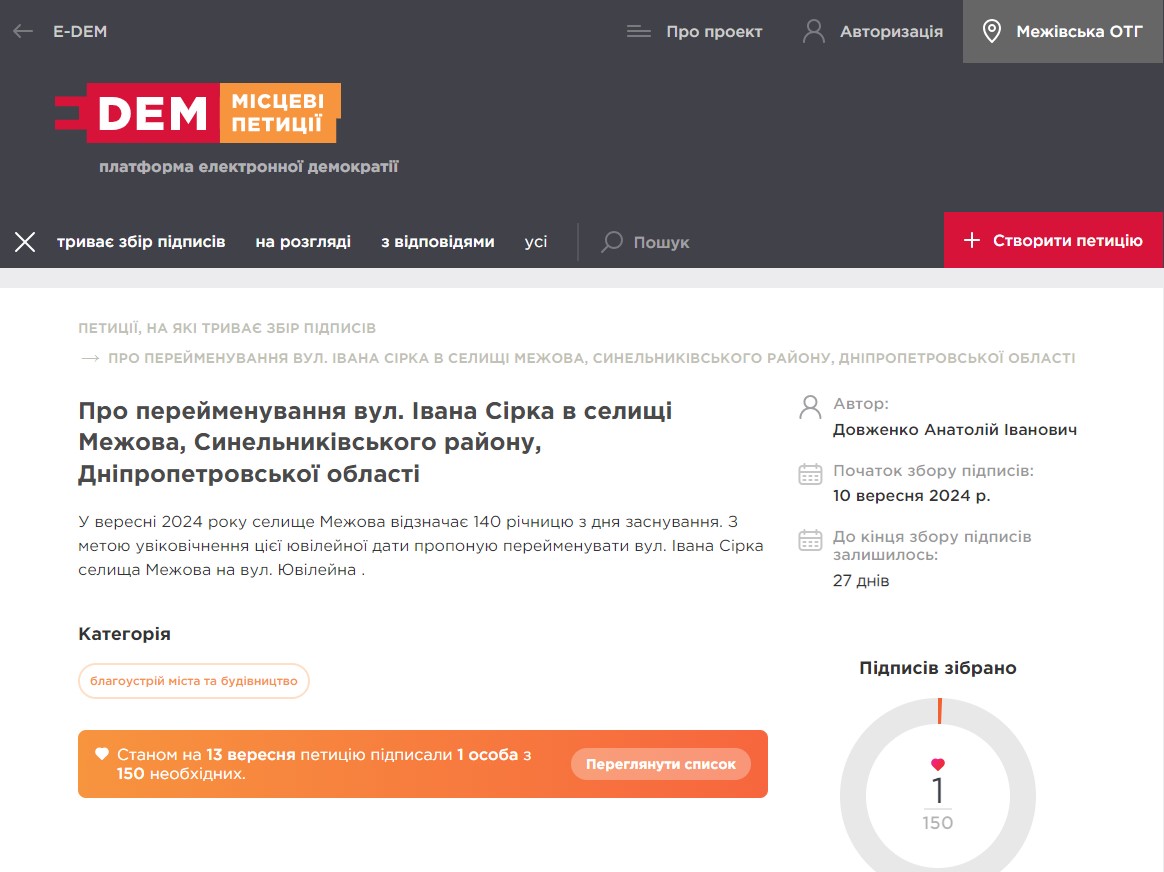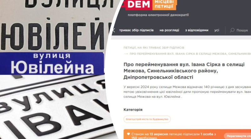 У зв’язку з відзначенням 140-ї річниці селища Межова Синельниківського району, що на Дніпропетровщині, яке відзначається у перші дні вересня 2024 року, жителями вулиці Івана Сірка (смт Межова) запропоновано підписати електронну петицію щодо перейменування вулиці на Ювілейну.
