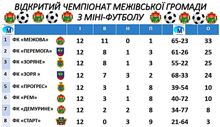 XII тур Відкритого чемпіонату Межівської громадии з міні-футболу подарував нам ЧЕМПІОНА першості! Ним стала ФК «МЕЖОВА», яка у звітному турі здолала ФК «ДЕМУРИНЕ» – 9:0 і набрала 33 залікових пункти.