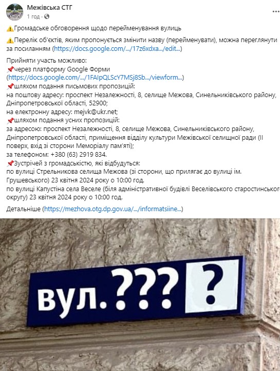 Виконавчий комітет Межівської селищної ради повідомив про початок проведення Громадського обговорення щодо перейменування вулиць та інших об’єктів топонімії Межівської селищної територіальної громади та запрошує усіх бажаючих долучитись до обговорення даного питання.