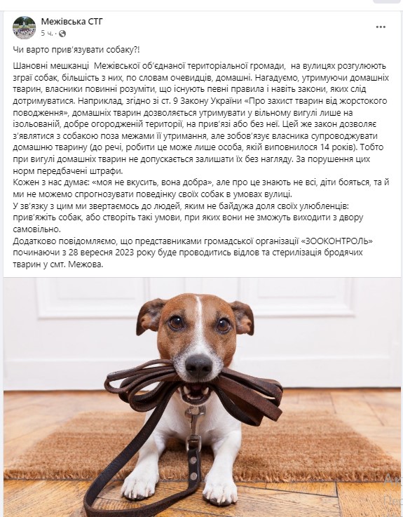 Додатково повідомляємо, що представниками громадської організації «ЗООКОНТРОЛЬ» починаючи з 28 вересня 2023 року буде проводитись відлов та стерилізація бродячих тварин у смт. Межова”.