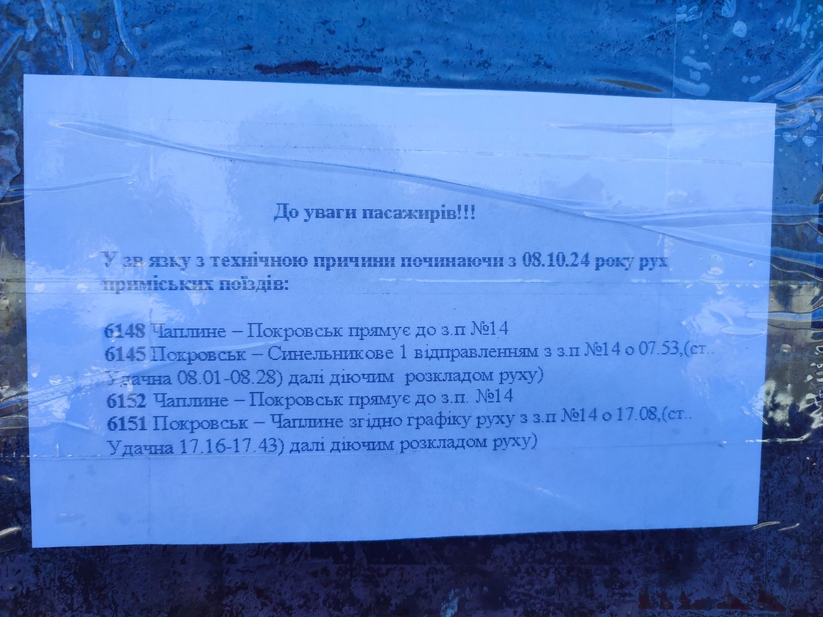 6151 Покровськ – Чаплине – згідно графіку руху з з.п. 14 о 17.08 (ст. Удачна 17.16 – 17.43) – далі за діючим розкладом ру