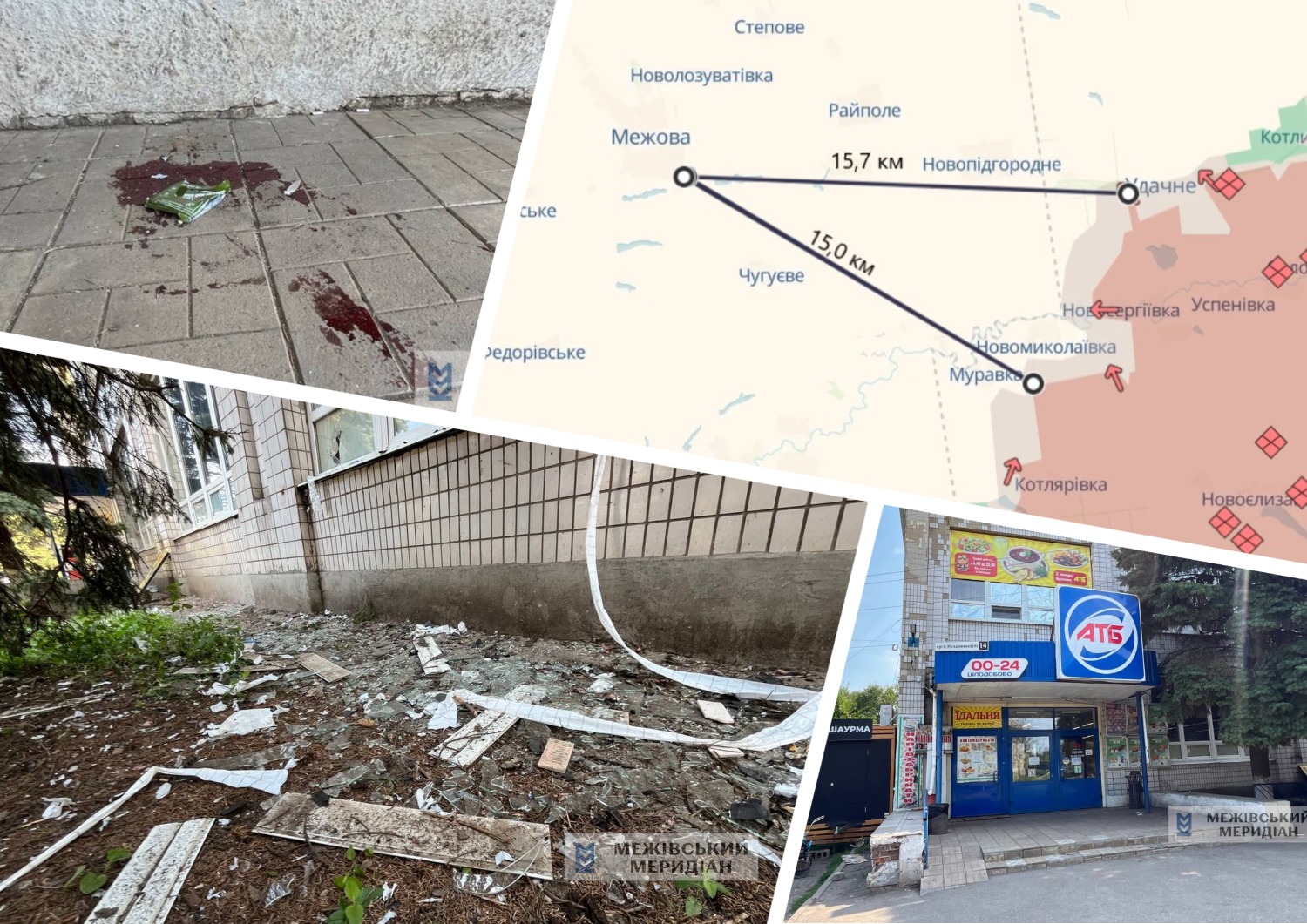 Ворожий дрон знову атакував магазин АТБ (який вже сьогодні не працював)  у самісінькому центрі Межової. Внаслідок удару осколками зачепило жінку, їй надали першу допомогу. Про стан зараз невідомо.