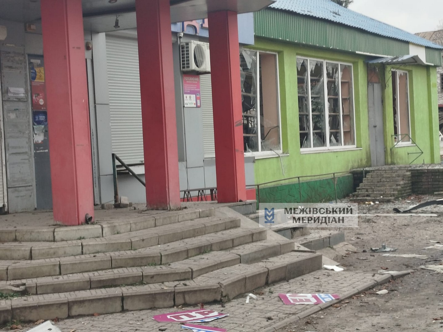 Пошкоджені практично всі магазини цієї частини селища, нотаріальна контора, адмінбудівля, дитячий садочок “Сонечко”, багатоквартирні приватні будинки, автомобілі…