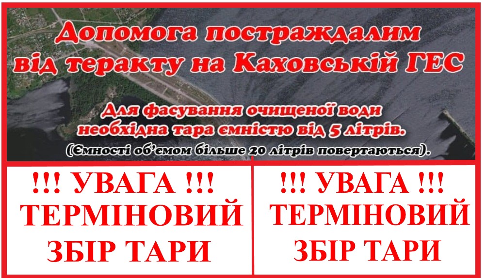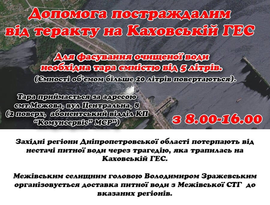 Межівська селищна рада прохає всіх небайдужих мешканців громади долучитись до забезпечення постраждалих внаслідок підриву греблі Каховської ГЕС питною водою.